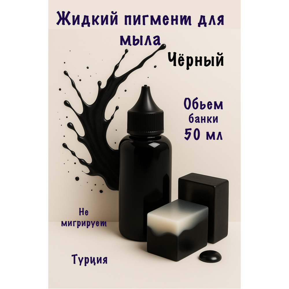 Чёрный пигмент — глубокий и насыщенный цвет, который придаёт мылу эффект угольной чистоты, строгости и контрастности. Он идеально подойдёт для мужских мыльных наборов, а также для мыла в стиле минимализм, монохром, урбан. Отличный выбор для создания мыла в виде угля, гранита, резины, шин, инструментов, игровых джойстиков и других тематических фигур. Может использоваться и как дополнительный акцент для затемнения других оттенков.